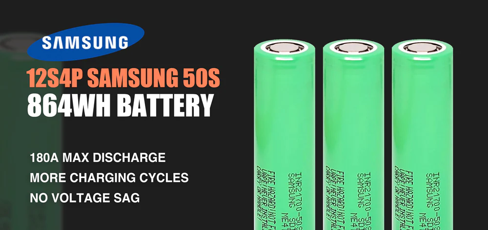 Akumulator to najważniejszy element każdego elektrycznego longboardu, dlatego Tynee stawia na jakość. W wersji 864Wh wyposażono go w wysokiej klasy ogniwa Samsung 50S (12S4P), które oferują napięcie 50.4V – znacznie wyższe niż standardowe 42V stosowane przez konkurencję. W rezultacie otrzymujesz większą niezawodność, dłuższą żywotność i lepszą wydajność podczas jazdy. Zawierają one